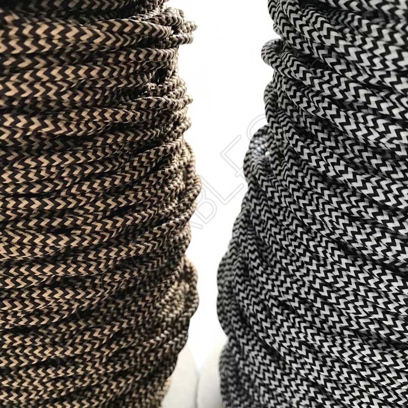 Dale un toque decorativo vintage pero actual a tus instalaciones eléctricas, con este cable flexible trenzado de dos hilos de cobre recubierto en tejido de algodón blanco y negro en zig zag.