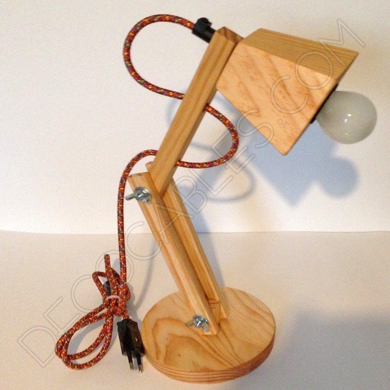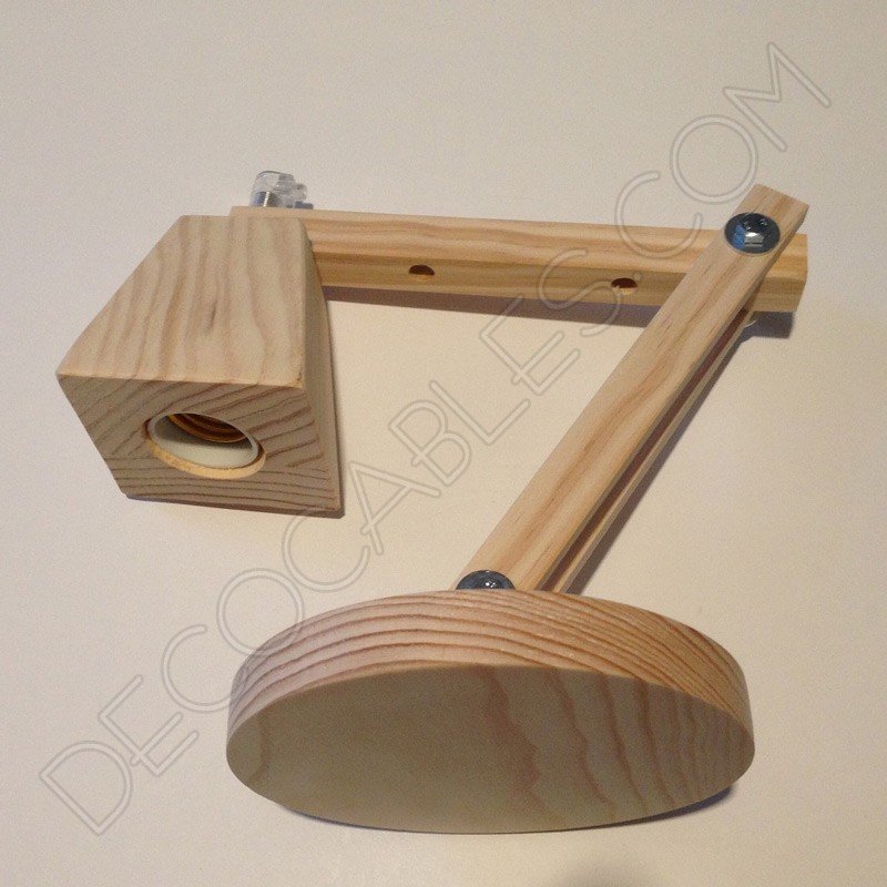 Flexo articulado de madera de pino con tuercas de palomilla. Foco en madera formato trapecio. Diseño único con un toque Retro. Sólo disponible en nuestra tienda online. La madera aporta calidez y elegancia a tu decoración eléctrica y nunca pasa de moda. Con la madera siempre acertarás.