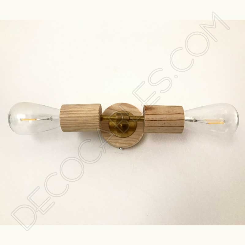 Foco Aplique de madera con brazo fijo doble. Lámpara Aplique de pared en forma de foco fabricado con madera de pino nacional y accesorios de latón de dos brazos fijos.