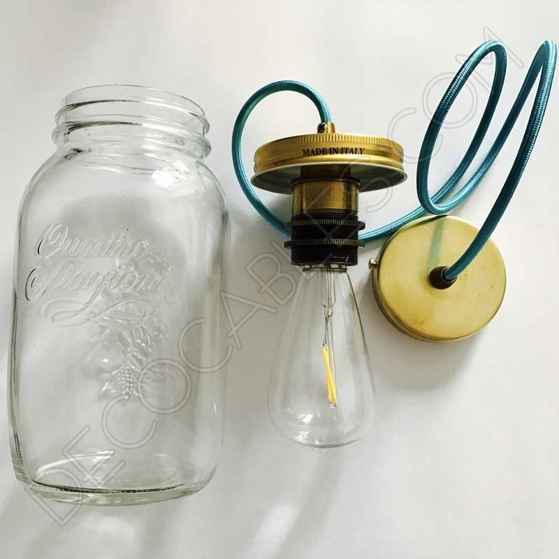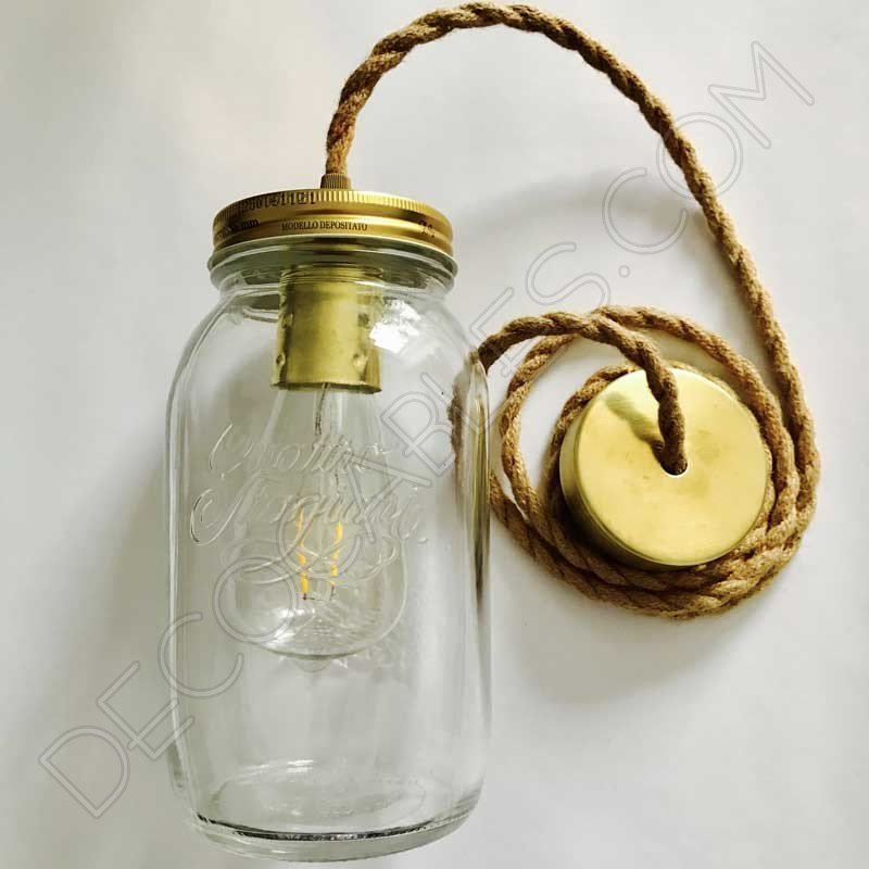 - Tarro grande con cable trenzado de algodón (indicar color en observaciones), textil (indicar color en observaciones), trenzado de cuerda o cuerda redonda de 2 x 0,75 en dos medidas: 50cm,1m y 1,5m, soporte de techo latón de 80mm de diámetro, portalámparas metálico oro viejo.