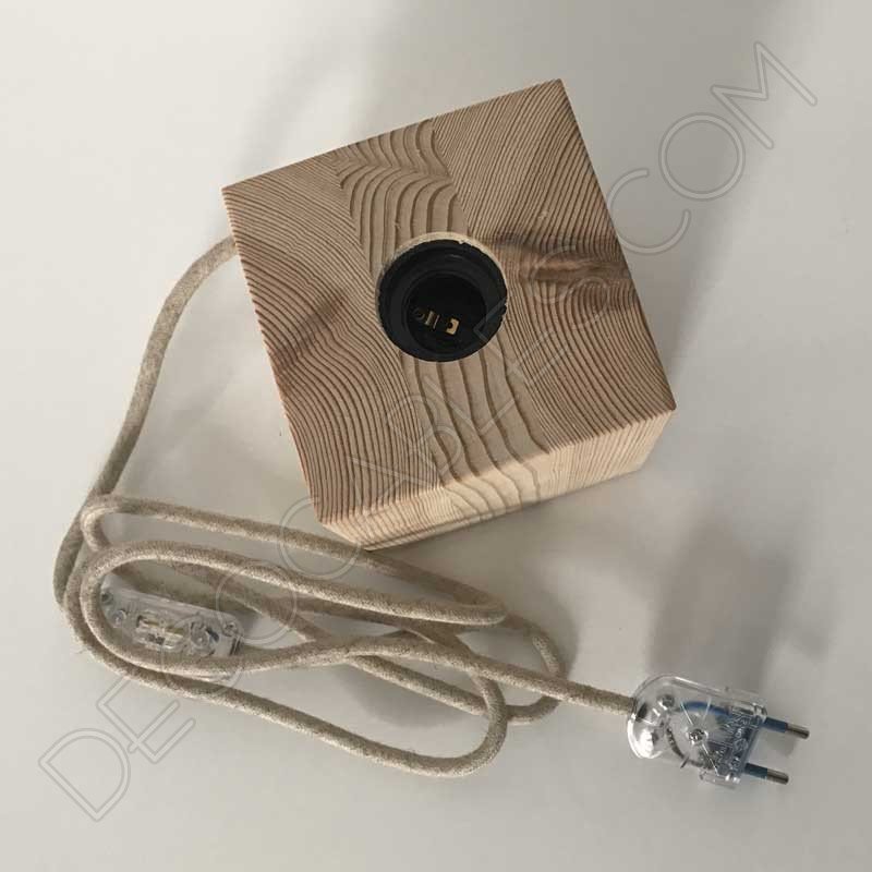 Se sirve en color madera natural, pero puedes barnizarla o pintarla a tu gusto. Así como cambiar el color del cable que mejor se adapte a tus necesidades. Sólo tienes que indicarlo en tu compra. Incluye clavija e interruptor de paso transparentes.