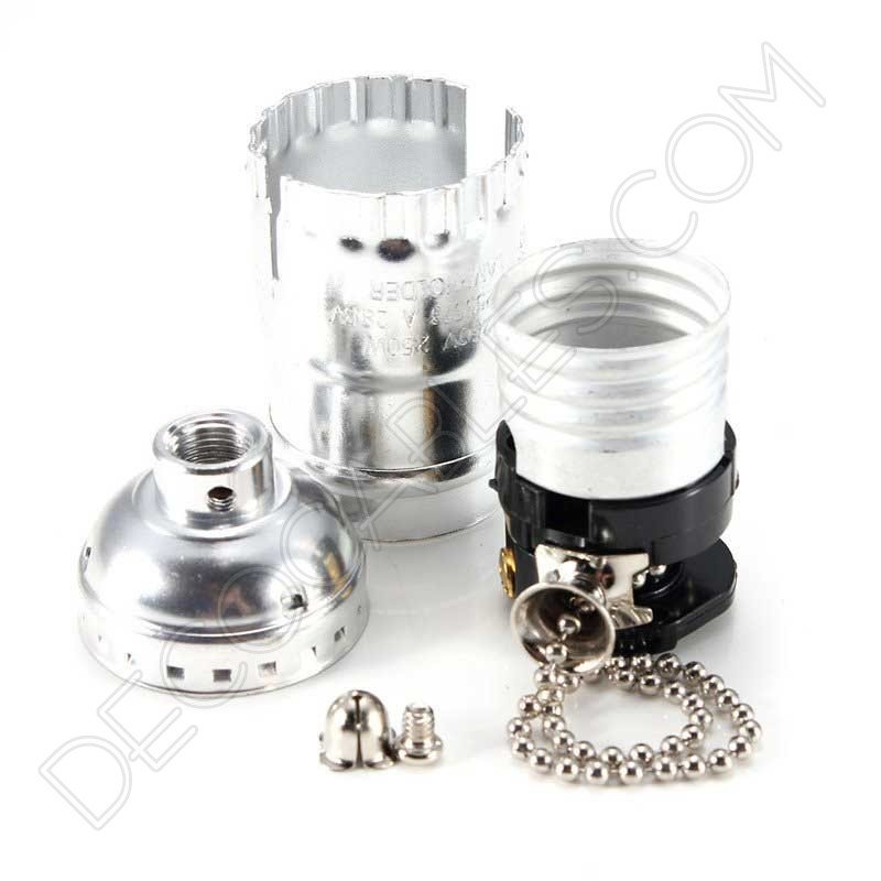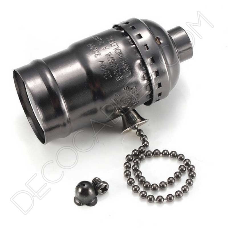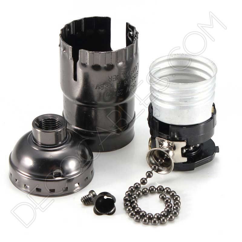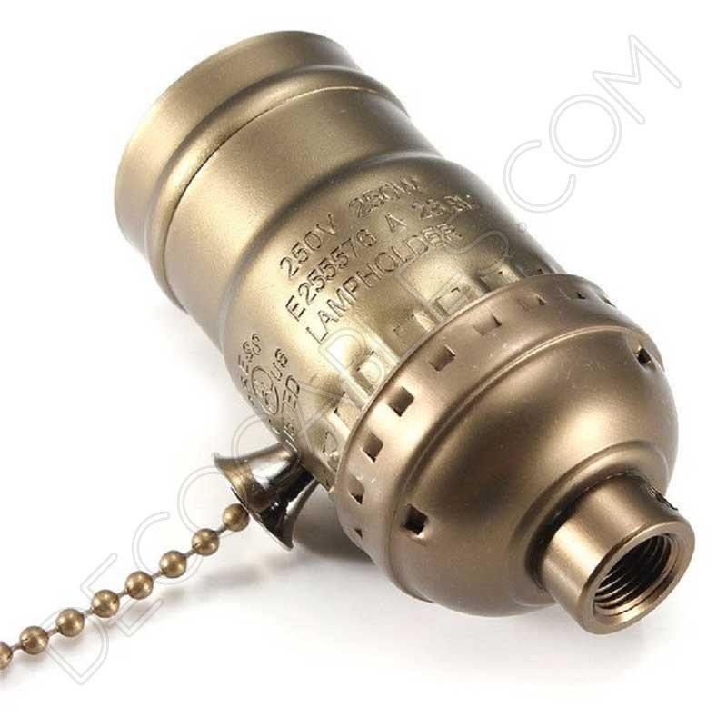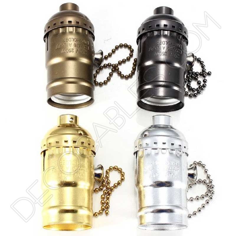 Portalámparas estilo Vintage de latón con cadena interruptor independiente modelo básico. Rosca de paso universal para rácor y tubo roscado. Apertura y cierre de la cúpula a presión. Disponible en varios colores. Muy utilizado para hacer lámparas colgantes y dejar a la vista. El tirador de cadena sirve para encender o apagar la bombilla independientemente sin necesidad de otro interruptor en la pared.